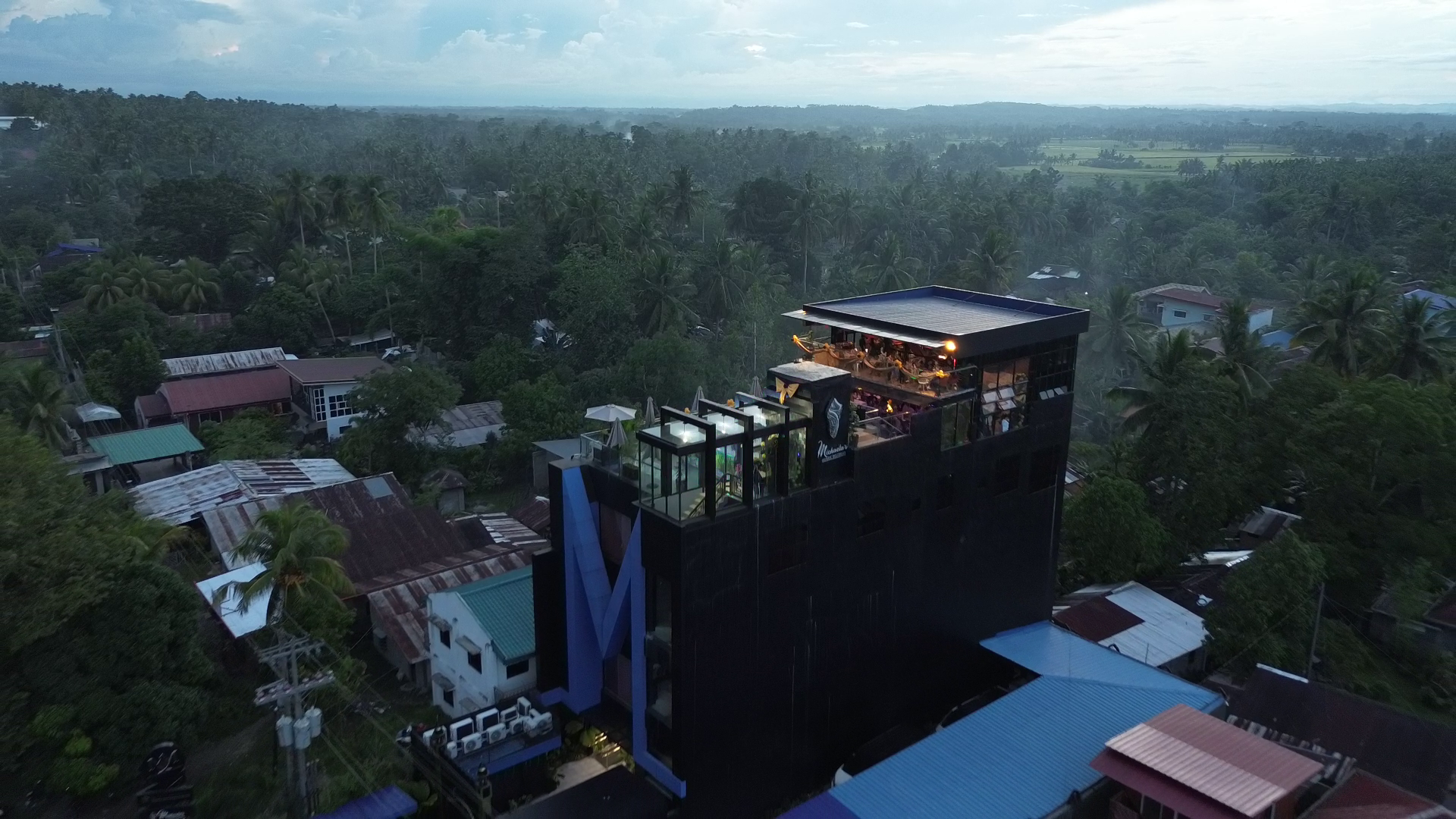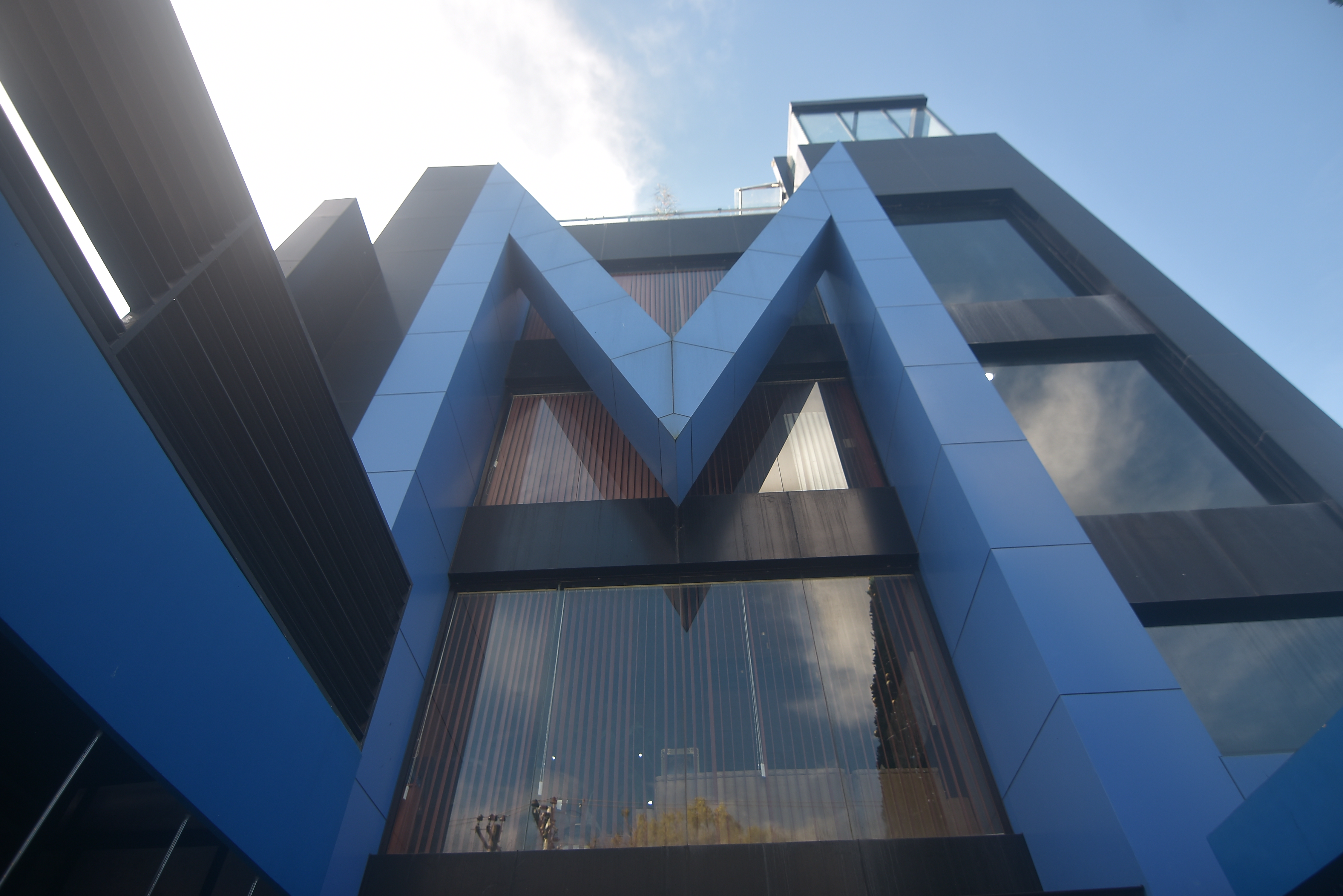 The building features a bold, modern design with a large blue “M” on the front that makes it stand out.